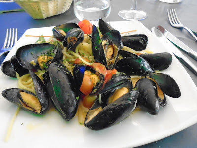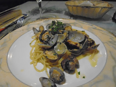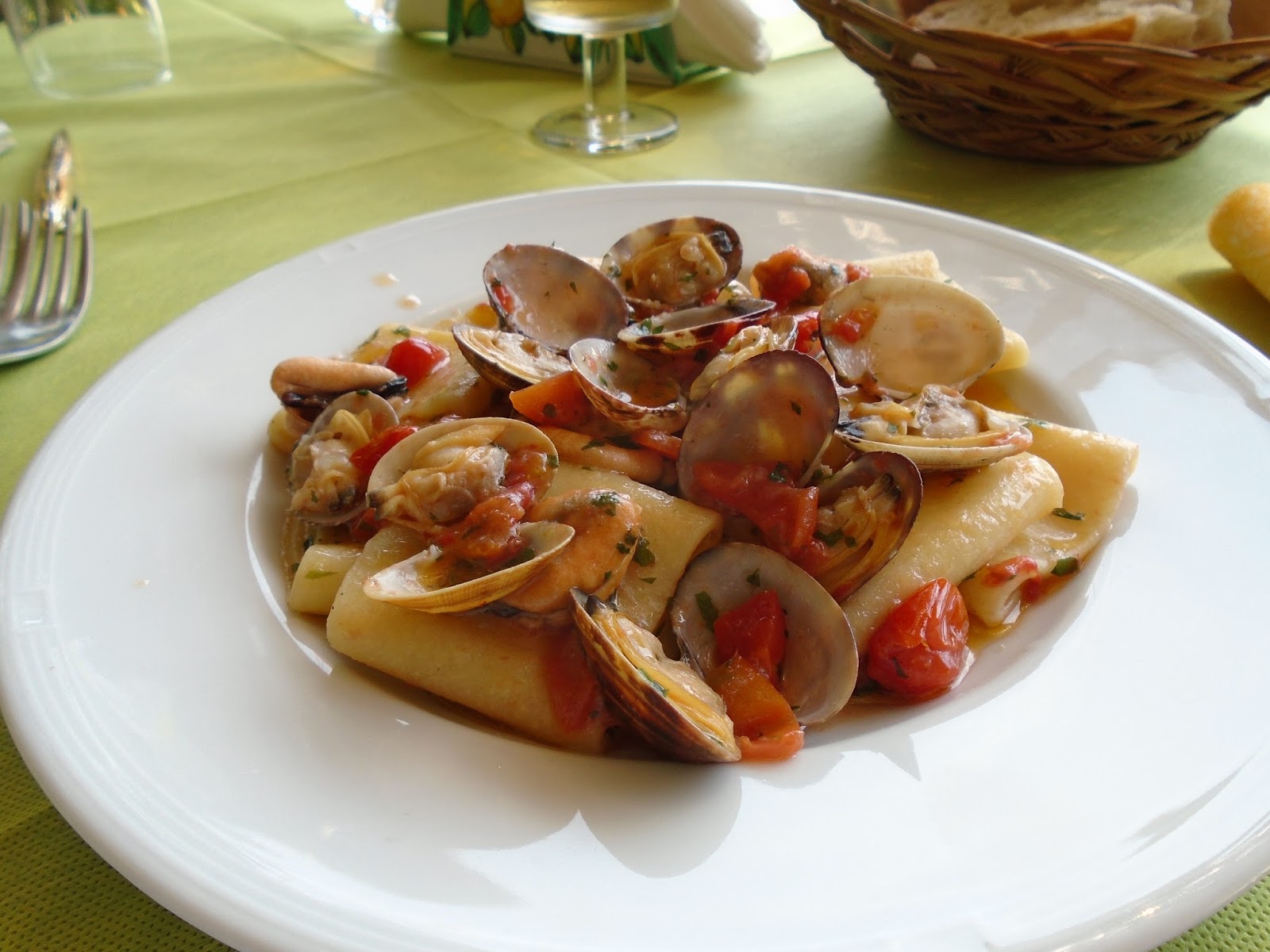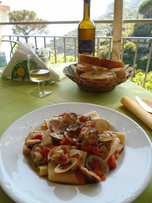 So after I showered and put on some fresh clothes and went back out to the terrace (terrazzo) Vincenzo asked me if I wanted a little pasta?Hell Yeah!!! Then Vincenzo asked if I wanted some wine. Again, Heck Yeah! I had his Vino Bianco, and when he brought me the plate of pasta(Paccheri with Clams & Mussels) that Maria made me, I was in 7th Heaven!